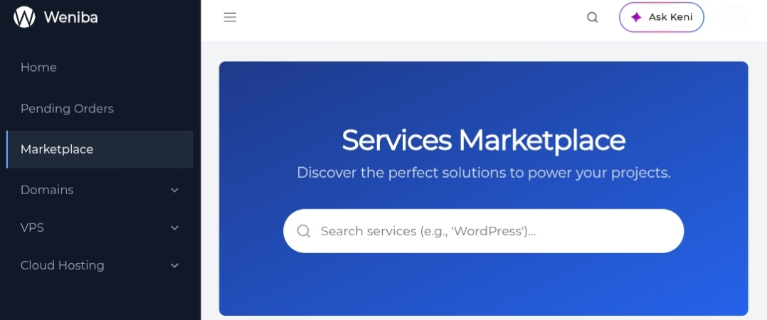 Expanding your digital toolkit has never been easier. The new Services Marketplace is your central destination for discovering and ordering all products offered by Weniba. From this single hub, you can easily browse, compare, and purchase new services like our high-performance VPS, scalable Cloud Hosting, and a vast selection of domain names. Each offering is presented with clear pricing and feature breakdowns, empowering you to make informed decisions that best suit your project's needs. The Marketplace is designed to grow with you, making it simple to find and deploy the resources you need to expand your digital footprint.